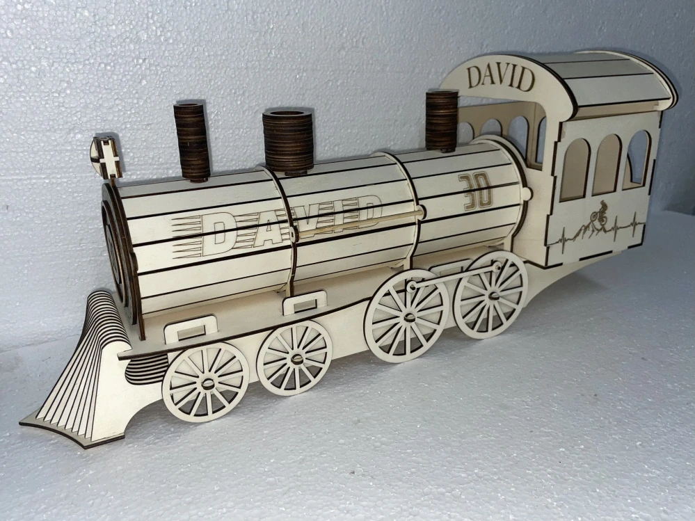 Precizně vyřezaná laserem z kvalitní překližky a sestavená do detailního modelu parní lokomotivy, která slouží jako designový držák na láhev vína, rumu nebo jiného oblíbeného nápoje.
